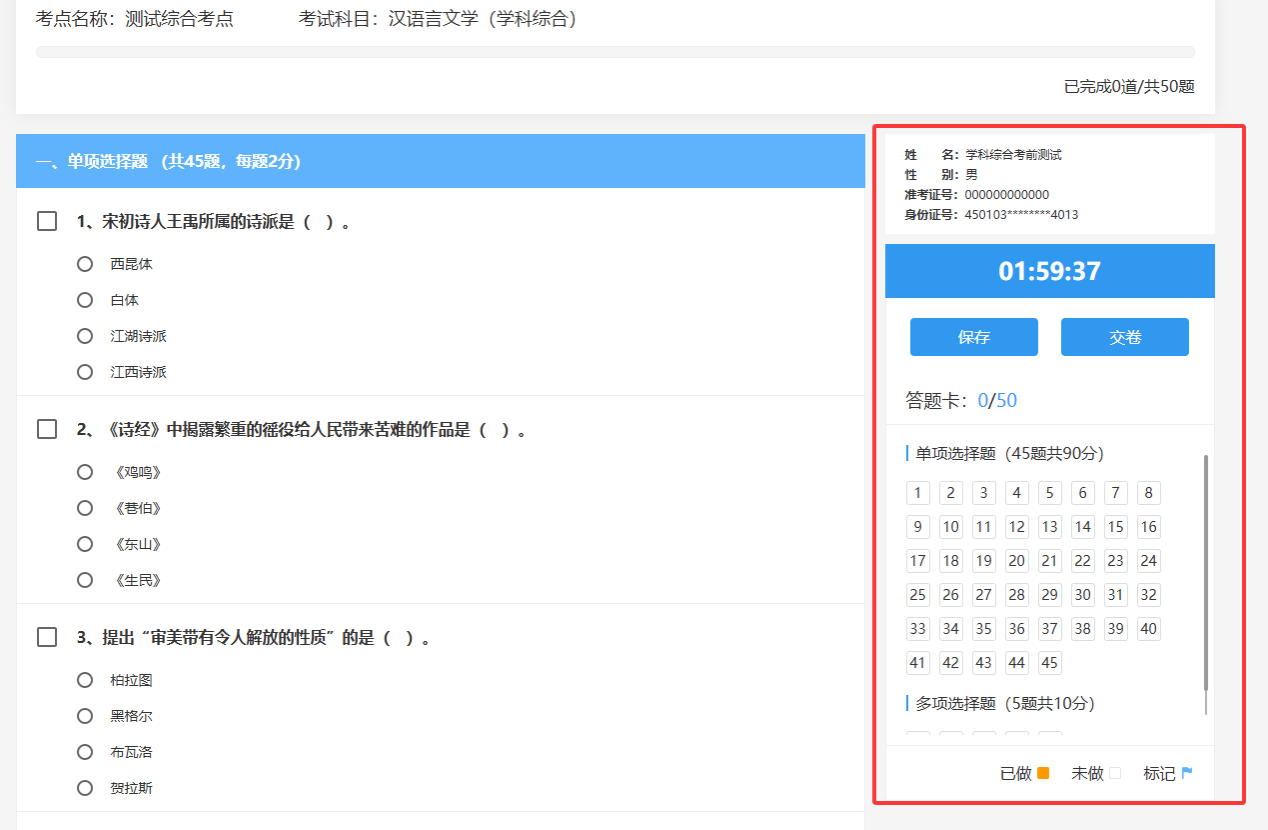 2.操作须知:每个科目考试有三次机会,未完成考试,请勿点击【提交】,