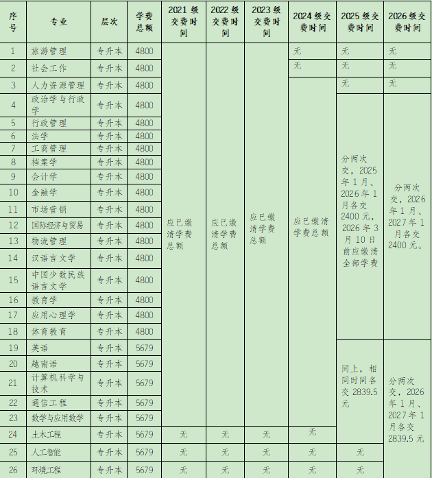 广西民族大学2021-2026级高等学历继续教育各专业学费总额及交费时间一览表