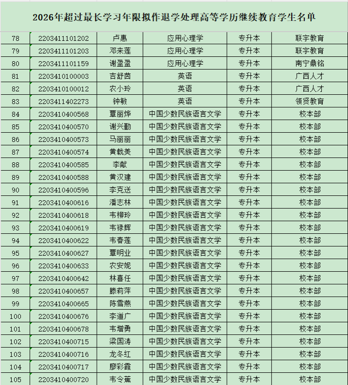 为规范学籍管理,维护正常教育教学秩序,根据《普通高等学校学生管理规定》(教育部41号令)《广西壮族自治区成人高等教育学生学籍管理暂行规定》(桂教〔2003〕4 号)以及学校相关管理规定,经研究,拟对以下105名超过最长学习年限未完成学业的学生作退学处理,具体名单见附件。