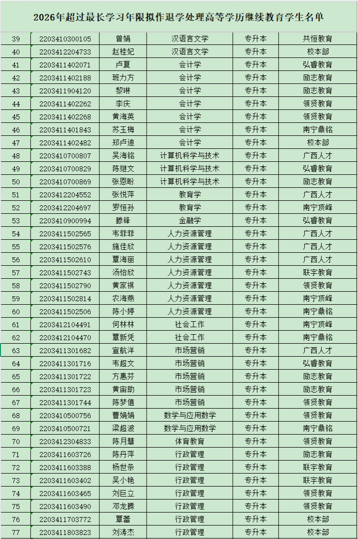 关于对2026年超过最长学习年限高等学历继续教育学生拟作退学处理的公示
