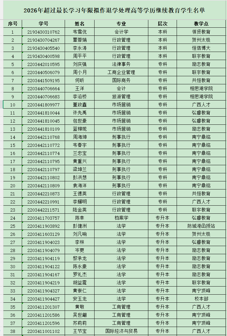 1.韦雪优等4名2019级高等学历继续教育高起本层次学生,于2026年2月2日超过最长学习年限(7年),且未申请办理结业或肄业手续。